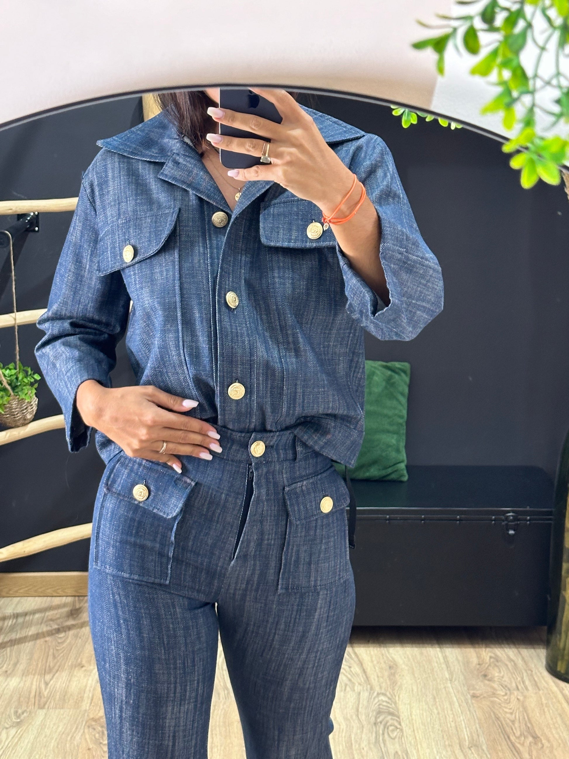 La veste courte en jean TOSCA avec ses boutons dorés est donc une pièce incontournable pour celles qui souhaitent ajouter une touche d'élégance subtile à leur look décontracté. Son allure intemporelle et ses détails raffinés en font un vêtement versatile et moderne.